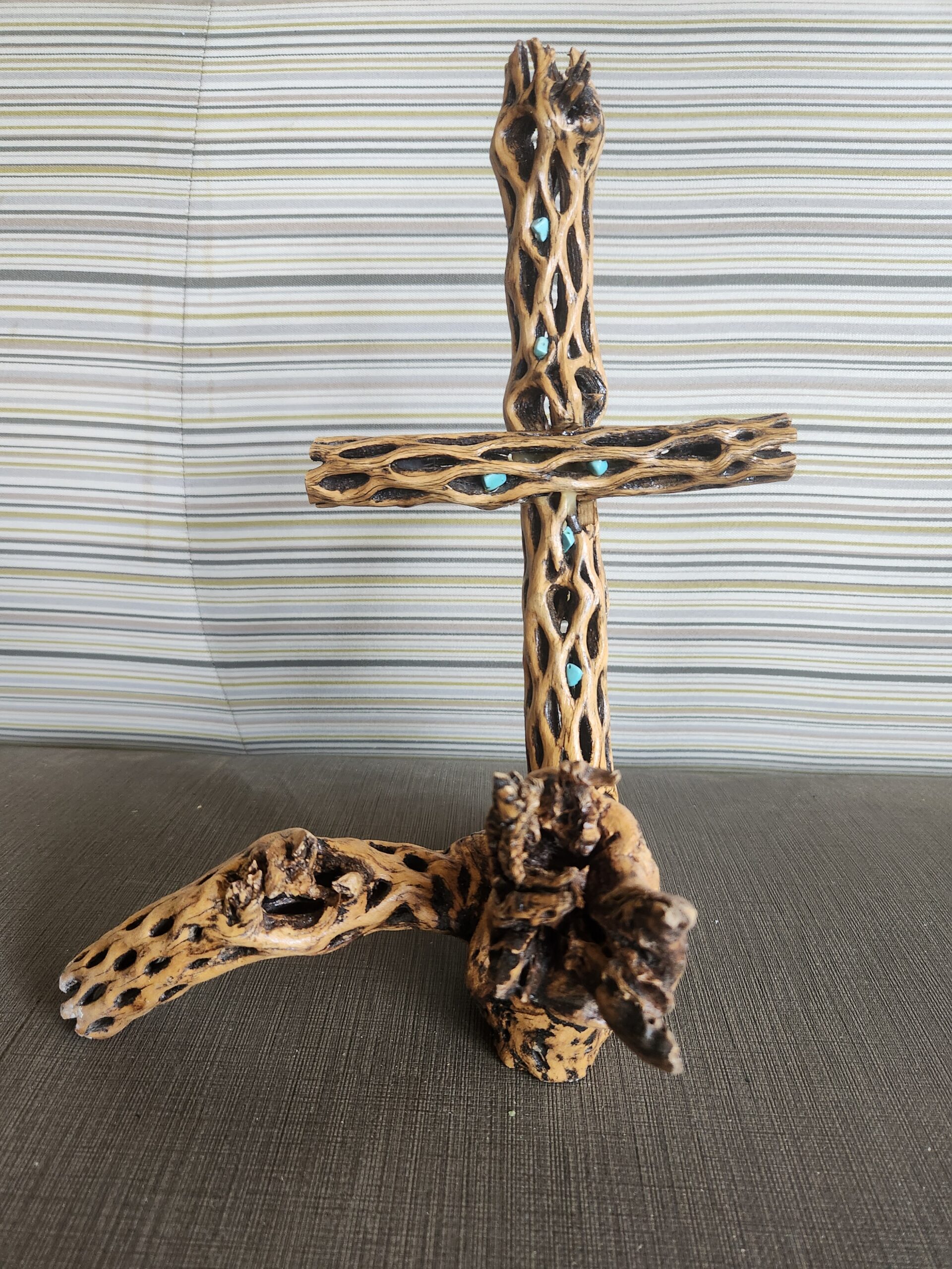 Rudy’s unique medium is the skeleton of the cholla cactus, gathered sustainably from the land around his home in Northern New Mexico. The process is one of patience and reverence: the dried cholla is cleaned, stabilized, and meticulously hand-finished to reveal its porous, intricate structure. This natural, rugged material is then transformed into sacred items, including functional walking canes and traditional crosses.