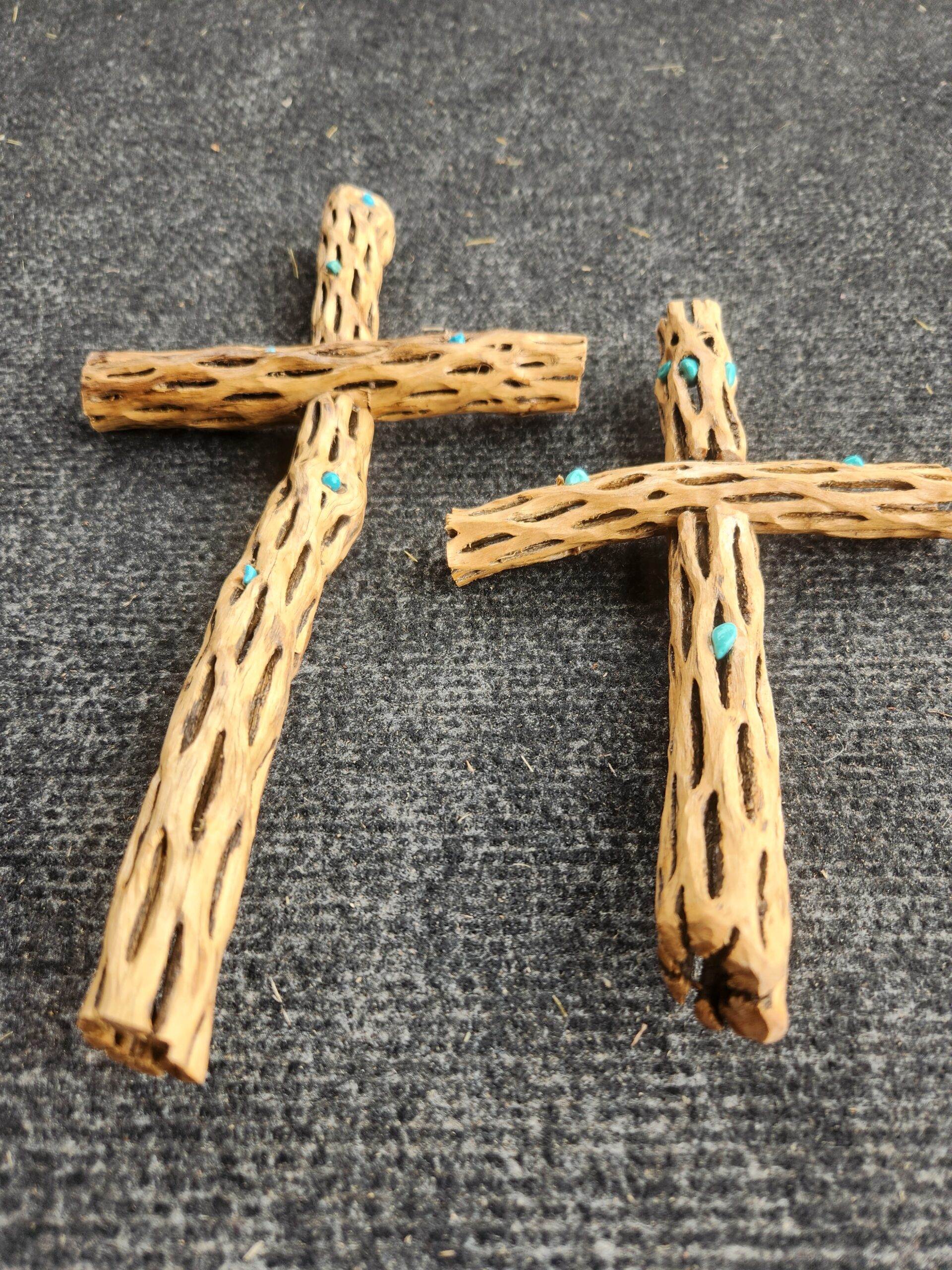 Explore the full range of Rudy Martinez’s handcrafted art below. Every item, from the sturdy walking canes to the traditional devotional crosses, is meticulously crafted from sustainably sourced cholla cactus gathered in the Mora County region. Witness the intricate beauty of the cholla’s natural structure and the skill of a veteran artisan as this resilient desert material is transformed into sacred items—each piece deeply rooted in tradition and carrying the authentic soul of Northern New Mexico.